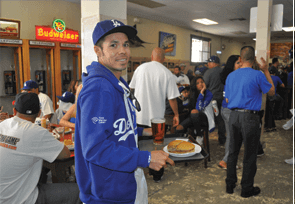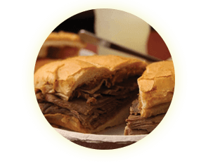 Philippe’s “French Dipped Sandwich” is the specialty of the house and consists of either roast beef, roast pork, leg of lamb, turkey or ham served on a lightly textured, freshly baked French roll which has been dipped in the natural gravy of the roasts. Swiss, American, Monterey Jack or Blue cheese may be added. To accompany your sandwich we offer a tart, tangy cole slaw, homemade potato and macaroni salads, hard boiled eggs pickled in beet juice and spices, large Kosher style, sour dill or sweet pickles, black olives and hot yellow chili peppers.